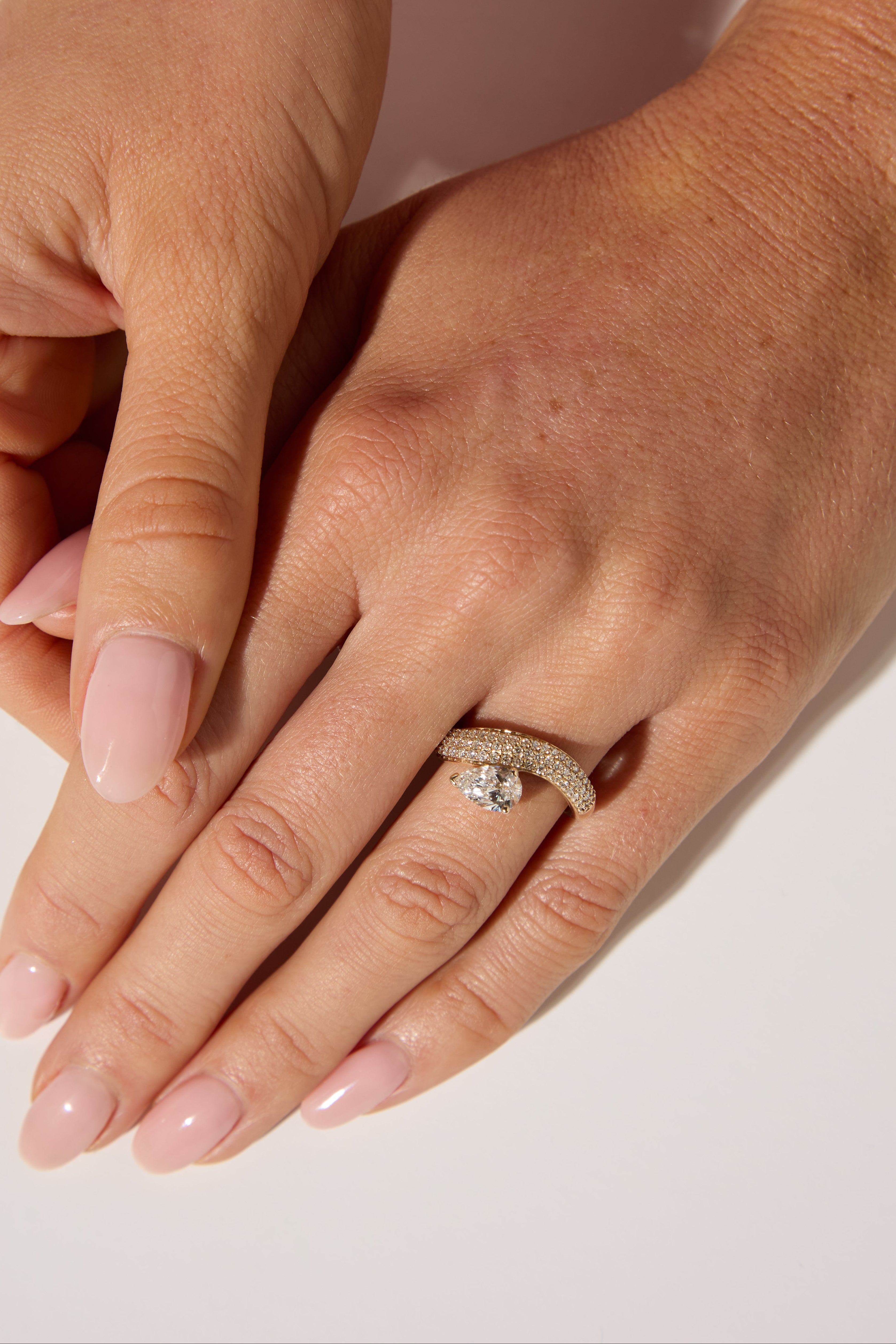 A striking 9ct yellow gold statement ring showcasing a dazzling 1.00ct pear-cut lab diamond, gracefully set upon a flowing triple-row pavé wave band. The wave design is adorned with 0.64ct of brilliant diamonds, creating a luminous cascade of sparkle.